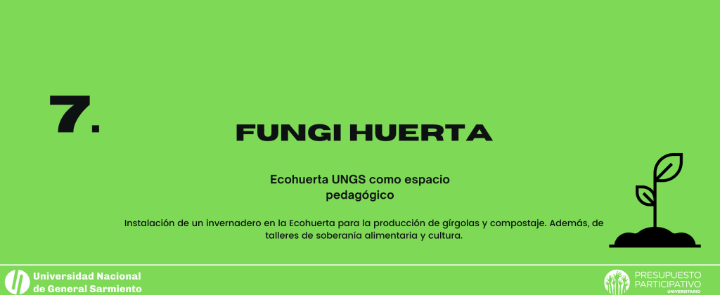 Este proyecto propone la consolidación de la ecohuerta UNGS como espacio pedagógico, productivo y cultural mediante la instalación de un invernadero, un sistema de compostaje integral, la producción agroecológica de gírgolas (Pleurotus spp.) y la implementación de jardines nativos con enfoque biocultural. Se prevé la realización de talleres educativos, artísticos y ambientales vinculados a soberanía alimentaria, cosmovisión de pueblos originarios y restauración ecológica.